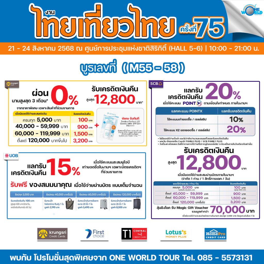 One World Tour and Travel ชวนมาพบกันที่งาน “ไทยเที่ยวไทย ครั้งที่ 75 + ไทยเที่ยวนอก Exclusive” งานนี้เราจัดเต็มโปรโมชั่นสุดพิเศษสำหรับคนรักการเดินทางโดยเฉพาะ! ไปเปิดโลกที่ต่างแดนกับแพ็คเกจ #ไทยเที่ยวนอก สุดคุ้ม เราก็มีให้เลือกเพียบ!