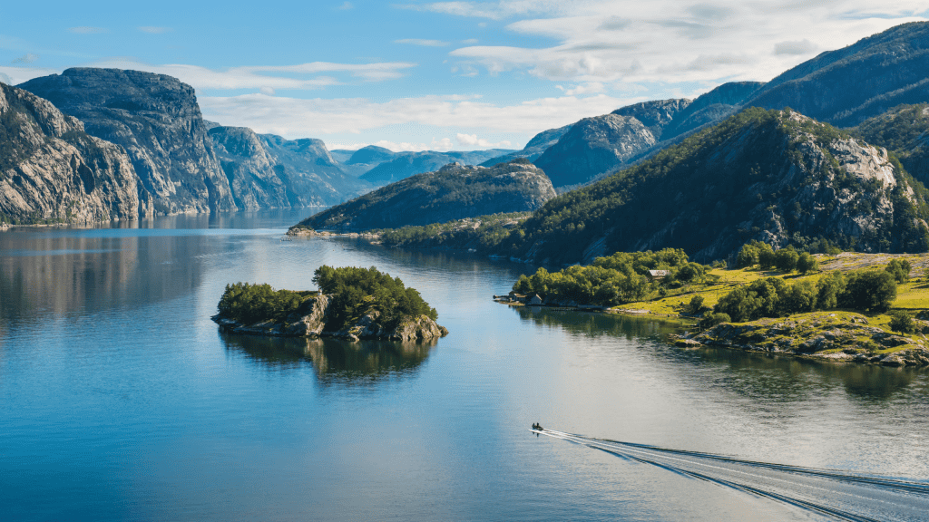 ‘ไลส์ฟยอร์ด’ แปลว่า “ฟยอร์ดแห่งแสง” มีความยาว 42 กม. ถูกขนาบข้างด้วยภูเขาสูงชัน โดยมีกำแพงหินตกลงไปในน้ำเกือบในแนวตั้งเกือบ 1,000 เมตร (3,000 ฟุต)