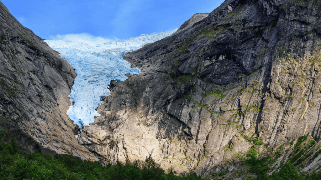 ธารน้ำแข็งตั้งอยู่ที่ปลายหุบเขาที่สวยที่สุดแห่งหนึ่งของนอร์เวย์ ล้อมรอบด้วยภูเขาสูงและน้ำตกไคลวาฟอสเซ่น (Kleivafossen) ที่เชิงธารน้ำแข็งมีทะเลสาบสีฟ้าครามขนาดเล็กซึ่งไหลผ่านแม่น้ำไหลไปตามเส้นทางสู่ธารน้ำแข็งและตั้งอยู่ภายในอุทยานแห่งชาติ Jostedalsbreen จากความสูง 1,200 เมตร ธารน้ำแข็งจะดิ่งลงสู่สู่ทะเลสาบในหุบเขา ‘Briksdalen Valley’ ที่แคบและอุดมสมบูรณ์ ซึ่งเป็นสถานที่ท่องเที่ยวที่ดึงดูดผู้มาเยือนจากทั่วทุกมุมโลกทุกปี