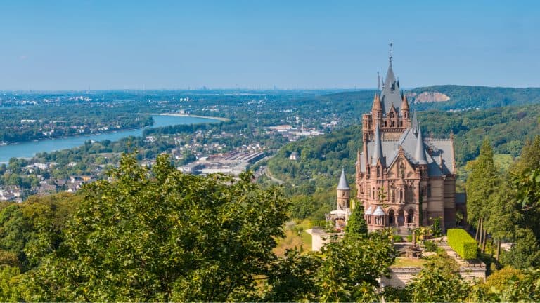 เยอรมันเหนือ – เดนมาร์ก * ฮันซีติก 11 วัน #1 ?? ?? ประเทศเยอรมันมีปราสาท ป้อมปราการ และซากปรักหักพังกว่า 25,000 แห่ง ! แล้วเราเคยอยากเห็นเทพนิยายมีชีวิตขึ้นมาไหม? เราเดินผ่านป่าและภูสูงสู่ปราสาทโบราณที่ทุกอย่างยังเหมือนเมื่อเกือบ 200 ปีก่อน ‘เคอนิจส์วินเทอร์’ Königswinter หมู่บ้านที่มีเสน่ห์แห่งนี้เป็นที่ตั้งของหนึ่งในปราสาทที่ได้รับการอนุรักษ์ไว้อย่างดีที่สุดของเยอรมนี ปราสาทดราเคินบูร์ก ‘Schloss Drachenburg’ สร้างขึ้นตั้งแต่ปี 1882-1884 น่าเสียดายที่ปราสาทตัวเองได้รับความเสียหายอย่างหนักในช่วงสุดท้ายของสงครามโลกครั้งที่ 2 และแม้จะมีการบูรณะตั้งแต่ปี 1995-2010 แต่ก็ยังสามารถมองเห็นรูกระสุนได้ที่ด้านหน้าปราสาท ปัจจุบันปราสาทดราเคินบูร์ก ได้รับการยกย่องว่าเป็นหนึ่งในปราสาทที่สำคัญที่สุดของศตวรรษที่ 19 ในเยอรมนี ตัวปราสาทตั้งอยู่บนยอดเขามังกร ‘Drachenfels’ ที่เกิดจากแมกม่าใต้เปลือกโลกที่สูงถึง 321 เมตรในแวดล้อมของป่าไม้และไร่องุ่น รอบๆ ปราสาทประดับด้วยต้นไม้โบราณและต้นโรโดเดนดรอน ‘Rhododendron’ หรือ กุหลาบพันปีและทิวทัศน์ที่น่าจดจำของหุบเขาไรน์